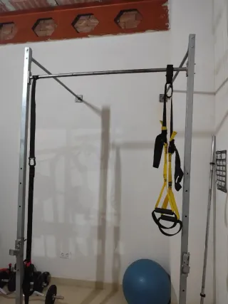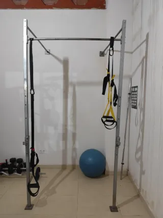 Equipo de gimnasio para entrenar en casa. - Estructura metálica resistente. - Barra de dominadas. - Barra para sentadilla, press banca