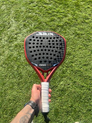 Pala de pádel Siux Fenix Elite 5. Tiene 1 mes, usada en unos 10 partidos y el golpe es solo pintura. Fue tontamente contra el suelo pasándole una bola a mi compañero. Por lo demás perfecta.