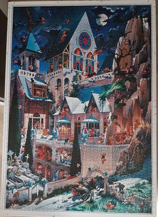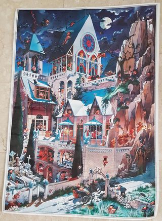 Puzzle de 2000 piezas con una escena de terror y fantasía. - Ilustración detallada de un castillo embrujado. - Figuras de criaturas y fantasmas. - Ideal para coleccionistas de puzzles temáticos. El puzzle se completo una vez, las piezas estan en muy buen estado, la marca heye tiene bastante calidad. La caja no la tengo, solo la lamina de guia.
