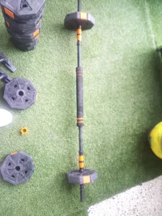 Conjunto de equipamiento para entrenamiento en casa. - Dos mancuernas con discos. - Barra de pesas. - Discos adicionales para mancuernas y barra.