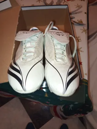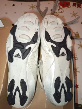 Botas de fútbol Adidas en color blanco con detalles en negro. - Talla 44. - Diseño deportivo.