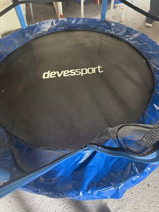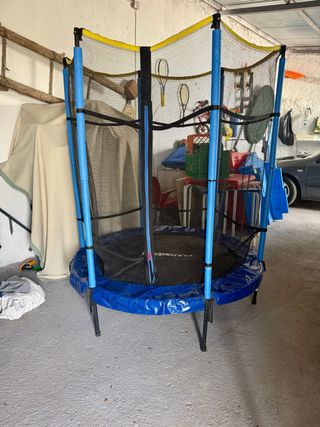 Cama elástica de seguridad para niños, ideal para jugar en interiores o exteriores. - 1,50 cm de diámetro. - Estructura de acero resistente. - Red de seguridad integrada. - Acolchado protector en los muelles y bordes. - Diseño en color azul y negro.