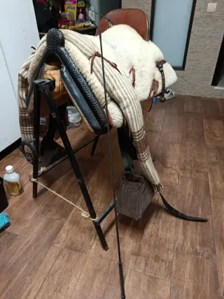 Conjunto de montura y cabezada de estilo vaquero. - Montura con manta de lana y detalles en cuero. - Cabezada a juego.