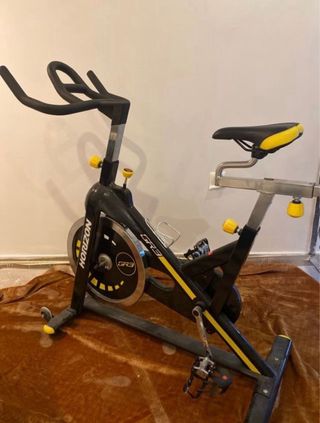 Bicicleta estática de la marca Horizon, modelo GR3. - Diseño deportivo en color negro y amarillo. - Volante de inercia visible. - Manillar y sillín ajustables.