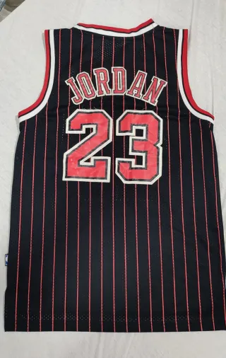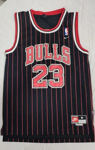 Camiseta de baloncesto de los Chicago Bulls con el número 23 de Michael Jordan. Diseño clásico a rayas. - Color principal: negro. - Detalles en rojo y blanco. - Logo de Nike y NBA. - Talla M.