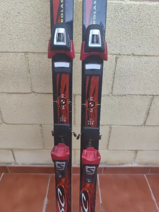 Esquís Rossignol de 175 cm con fijaciones. - Diseño deportivo en rojo y negro. - Marca Rossignol. - Longitud 175 cm.