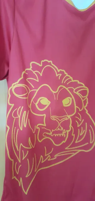 Camiseta deportiva con diseño de león y escudo. - Color rojo con detalles en amarillo. - Talla M. - Ideal para entrenamiento o uso casual.