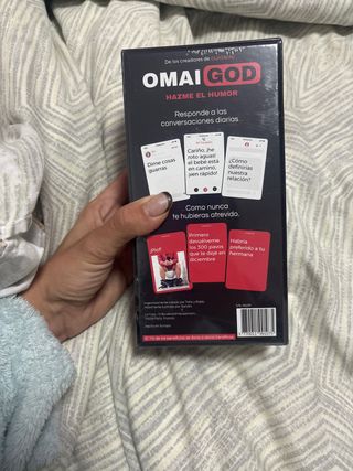 Juego de cartas OMAI GOD, para responder a conversaciones diarias. - De los creadores de GUATAFAC. - Incluye 3 ejemplos de conversaciones. - Como nunca te hubieras atrevido. - Hecho en Europa. - El 1% de los beneficios se dona a obras benéficas. TIENE HASTA EL PLÁSTICO, completamente nuevo.