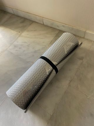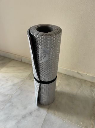 Esterilla aislante de la marca Quechua, ideal para actividades al aire libre. - Diseño con patrón geométrico. - Color plateado. - Se enrolla fácilmente y se sujeta con una banda elástica negra.