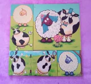 Conjunto de cinco lienzos con divertidas ilustraciones de animales. - Lienzos con diseño de ovejas y vacas. - Estilo de pintura infantil y colorido. - Ideales para decorar habitaciones o espacios lúdicos. Medidas: - 3 Pequeños: 20*20 cm cada uno - 1 Mediano: 40*20 cm - 1 Grande: 40*40 cm Si eres de Sevilla, se recoge en ALCALÁ DEL RÍO. Posibilidad de quedar en Sevilla algunos fines de semana, preguntar disponibilidad. Puedes ver más cositas en mi perfil. Se hacen envíos Wallapop