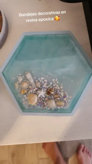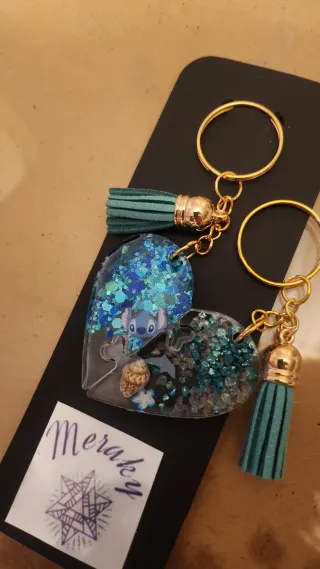 Llavero artesanal con diseño de corazón y personaje de Stitch. - Elaborado en resina. - Incluye detalles de purpurina azul y elementos marinos como conchas. - Adornado con un pompón de color verde azulado.