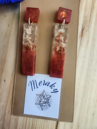 Pendientes largos hechos a mano con resina y flores secas. - Diseño rectangular con detalles en rojo. - Elementos florales en su interior. - Cierre de gancho dorado.