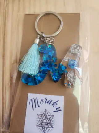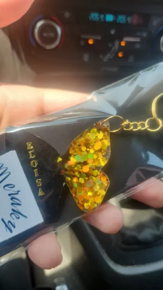 Llavero artesanal con forma de mariposa, hecho de resina y relleno de brillantina dorada y verde. - Diseño de mariposa. - Material: Resina. - Detalle de brillantina. - Incluye cadena y anilla.