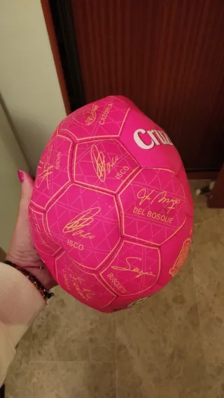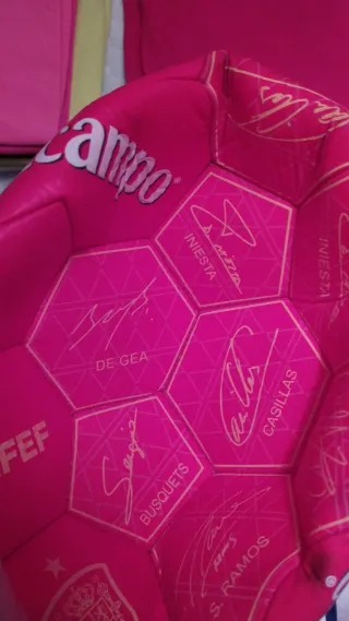 Balón de fútbol rosa de la Selección Española con firmas. - Diseño con paneles. - Firmas de jugadores visibles.