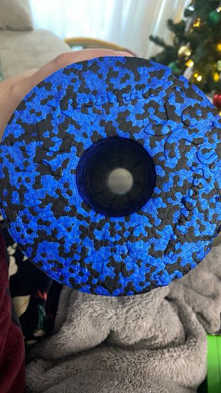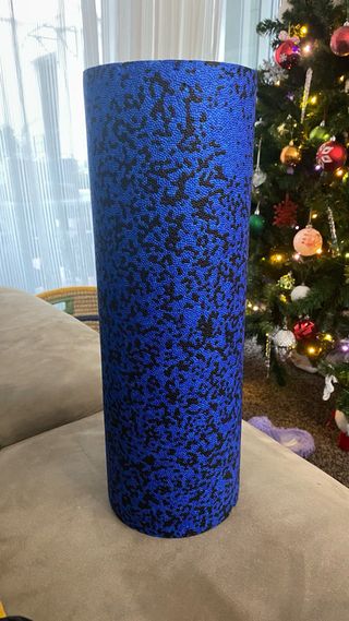 Rulo de yoga con un diseño llamativo en azul y negro. Ideal para ejercicios de recuperación y estiramientos. Marca Bodymate - Textura con relieve. - Forma cilíndrica.