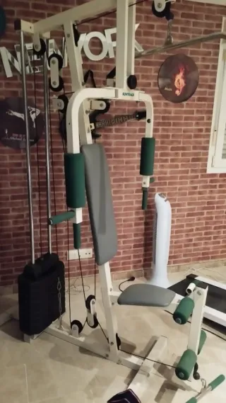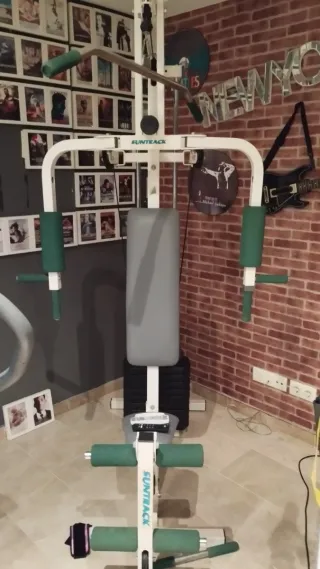 Máquina multifunción para entrenar en casa. Ideal para mantener la forma física. Marca Suntrack. Para piernas, abdomen, brazos, espalda. Hasta 90 lbs en pesas. - Estructura blanca y verde. - Asiento acolchado gris. - Torre de pesas negra.