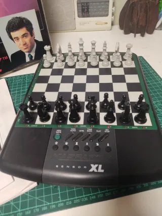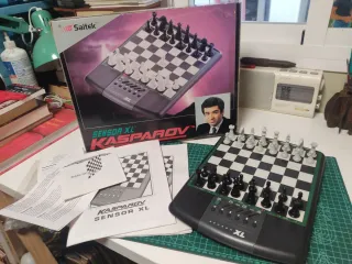 Precioso ajedrez electrónico del año 1995, de la casa Saitek, el Sensor XL Kaspárov, funcionando perfectamente y con todas sus piezas, manual de instrucciones en español y caja original.