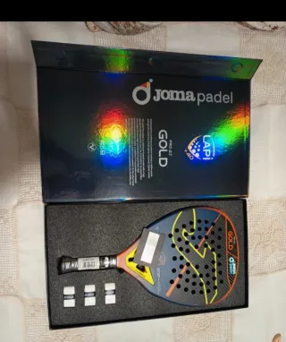 Pala de pádel Joma Gold 2.0, edición limitada. - Diseño moderno en negro, naranja y amarillo. - Incluye funda protectora. - Viene con tres protectores de grip Joma.