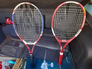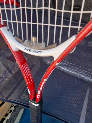 Se venden dos raquetas de tenis, una de la marca HEAD y otra de ARTENGO. Ambas son de color rojo con detalles blancos y azules. Hay que ponerle las cuerdas nuevas. - Raqueta HEAD con cordaje blanco. - Raqueta ARTENGO con cordaje blanco y detalles amarillos.