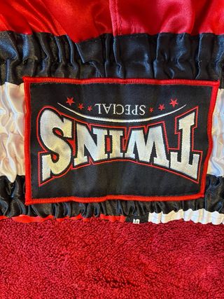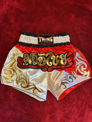 Pantalones cortos de Muay Thai de la marca Twins Special. Diseñados para el entrenamiento y la competición. - Color rojo y blanco con detalles dorados y plateados. - Cintura elástica con cordón para un ajuste seguro. - Tejido satinado brillante. kick boxing k1 muay thai fairtex