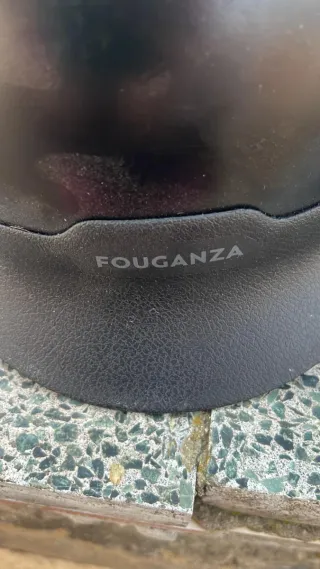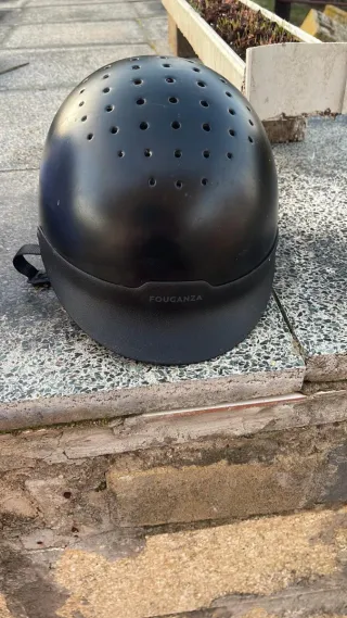 Casco de equitación Fouganza en color negro. Diseñado para ofrecer comodidad y ventilación. - Exterior liso y mate. - Múltiples orificios de ventilación. - Banda frontal con el logo 'FOUGANZA'.