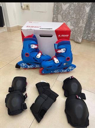 Set de patinete infantil en color azul, ideal para los más pequeños. Incluye protecciones para mayor seguridad. - Patinete de 3 ruedas. - Ajustable en altura. - Incluye, guantes rodilleras y coderas.