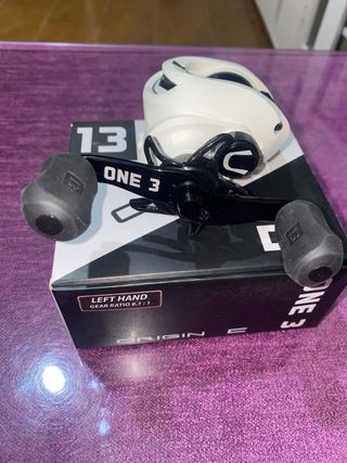 Carrete de casting 13 Fishing ONE 3 en color blanco y negro. - Modelo: ONE 3 - Mano: Izquierda (Left Hand) - Ratio de engranaje: 8.1:1 - Diseño moderno y elegante. pesca black bass lucio