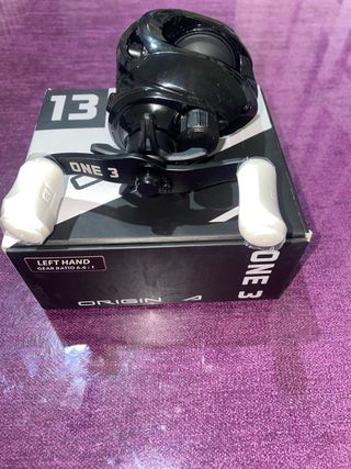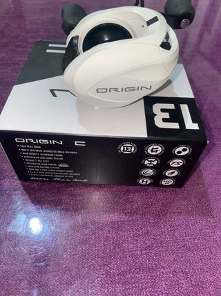 Carrete de pesca casting marca Origin, modelo 13. - 13 lb de arrastre máximo. - Construcción de marco compuesto ligero. - Sistema de guía de línea tipo punta de flecha. - Peso: 7.2 oz (204 g). - Nuevas perillas de mango suaves al tacto. - Retenedor de anzuelo integrado. - 6+1 rodamientos de bolas de acero inoxidable. - Sistema de frenado centrífugo de 9 vías.