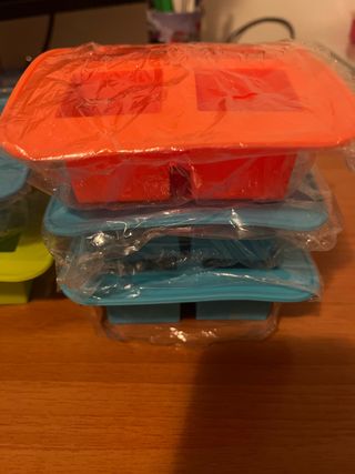 Set de moldes de silicona para hacer cubitos de hielo u otros usos. Están sin estrenar. - Color naranja. - Color azul. - Color verde. - Medidas: 3,8 x 3,8 x 3,8cm. - Unidades disponibles: 10 - Precio unidad: 1,80€