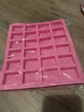 Molde de silicona de color rosa con múltiples cavidades cuadradas. - Material: Silicona - Color: Rosa - Diseño: Múltiples cavidades cuadradas (24 cavidades por molde) - Precio unidad: 1,50€ - Unidades disponibles: 2 - Medidas: 4 x 3 x 1cm Nunca se ha usado.