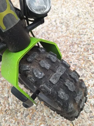 Se vende patinete eléctrico con guardabarros delantero de color verde brillante. El patinete tiene una rueda delantera con un diseño de tacos pronunciados, ideal para terrenos irregulares. - Guardabarros delantero de plástico verde. - Rueda delantera con dibujo todoterreno. El patinete tiene 80km esta en condiciones inmejorables. Tiene todas las omologaciones para sacarle seguro y circular en regla