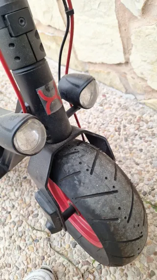 Patinete eléctrico con luces delanteras y guardabarros. - Color negro y detalles en rojo. - Rueda delantera con dibujo. - Luces LED integradas. PATINETE OMOLOGADO