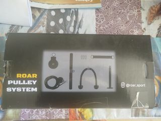 Sistema de polea ROAR para entrenamiento en casa. Incluye varios accesorios para diferentes ejercicios. - Polea con soporte. - Barra. - Cuerda. - Agarre. - Correa de tobillo.