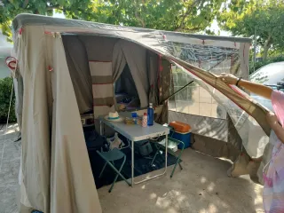Tienda de campaña estilo canadiense, ideal para acampadas. Falta una goma de las que se usan para clavar "fácil apaño" - Color azul y naranja. - Diseño de fácil montaje.
