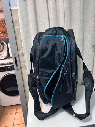 Bolsa de pádel de color azul marino con detalles en azul turquesa. Cuenta con varios compartimentos y asas para llevarla cómodamente. - Diseño moderno. - Material resistente. - Logo THE PADEL SPECIALIST.