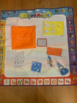 Manta de dibujo reutilizable para niños con temática Aqua Magic. Incluye accesorios para pintar con agua. - Manta de gran tamaño con diseño educativo. - Incluye formas de animales y letras. - Varios accesorios para colorear. - Ideal para el aprendizaje y la creatividad.