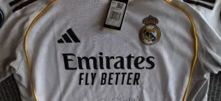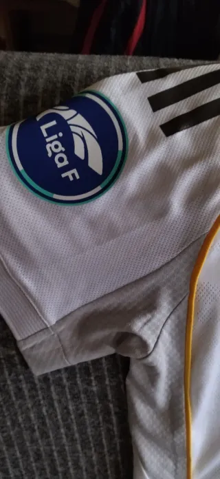 Camiseta oficial del Real Madrid Femenino. - Diseño blanco con detalles dorados. - Logo de Adidas y escudo del club. - Patrocinador Emirates Fly Better.