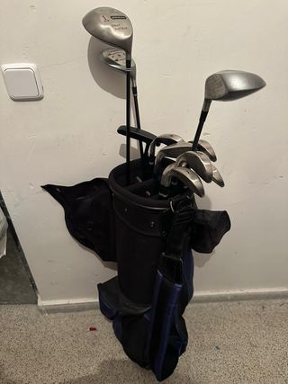 Set de palos de golf completo, - Incluye varios palos de diferentes tipos. - Bolsa de transporte negra y azul.