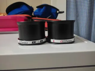 Se venden dos bobinas de la marca MV SPOOLS junto con un estuche de la marca Turkana. - Dos bobinas de carrete. - Un estuche para guardarlas.