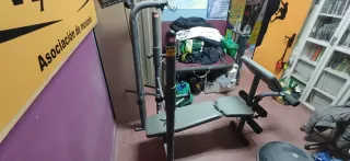 Equipo de gimnasio para entrenar en casa. Permite realizar diversos ejercicios de fuerza. - Estructura metálica robusta. - Banco acolchado. - Barras y soportes para pesas.