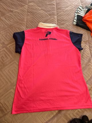 Camiseta de manga corta para mujer de la marca Power Padel. - Color rosa con detalles en blanco y azul marino. - Cuello tipo polo con botones. - Logo de la marca en el pecho.