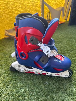 Patines en línea Oxelo para niños, diseñados para crecer con ellos. El ajuste permite adaptarlos a diferentes tallas. - Diseño en color azul y rojo. - Cierre de hebilla y velcro. - Ruedas con freno.