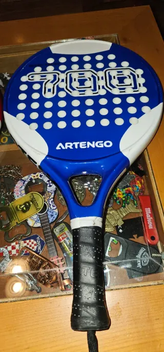 Pala de pádel de la marca Artengo con un diseño moderno en azul y blanco.