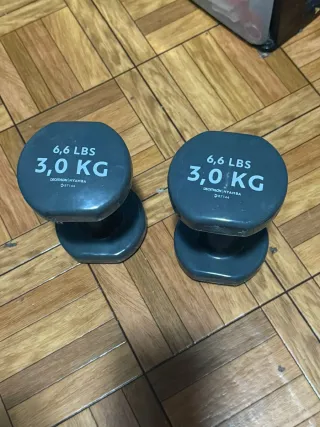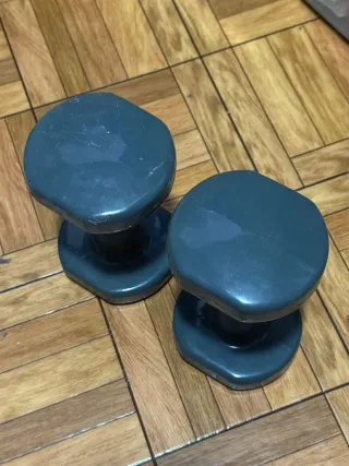 Par de pesas de color gris, ideales para ejercicios en casa. - Diseño ergonómico. - Material resistente.