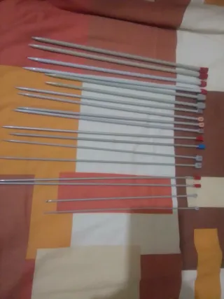 Conjunto de 16 agujas para tejer. MUY NUEVAS POCO USO - Agujas de metal plateado. - Variedad de tamaños. - Tapones de colores en los extremos. Se entrega en persona Visita mi página para ver otras ofertas