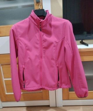 Chaqueta impermeable con forro polar en el interior y bolsillos internos. Talla M. Color fucsia. Pesa poco pero abriga. Vendo por no usar - Color rosa vibrante. - Cierre de cremallera frontal. - Bolsillos laterales con cremallera.