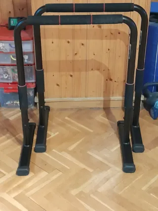 Barras paralelas de Decathlon en perfecto estado. Ideales para entrenar en casa. - 80 cms de altura y 56 cm de anchura entre barras. - Estructura metálica resistente. - Empuñaduras acolchadas para mayor comodidad. - Base estable para mayor seguridad. SOLO RECOGIDA EN ALCORCÓN.