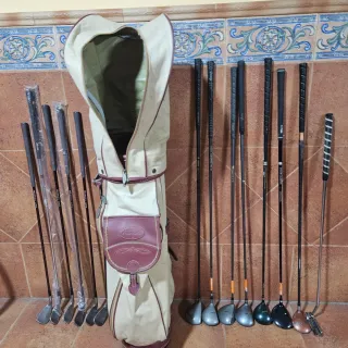 Set completo de 14 palos de golf, incluyendo 7 maderas y 7 hierros, junto con una bolsa de transporte. - Bolsa de golf de color beige con detalles en burdeos. - Incluye 7 maderas. - Incluye 7 hierros. - Diseño clásico y funcional.