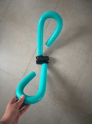 Equipo de ejercicio para tonificar piernas y muslos. Su diseño ergonómico permite un entrenamiento efectivo. - Color: verde azulado. - Material: plástico y espuma.