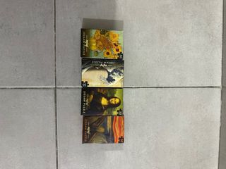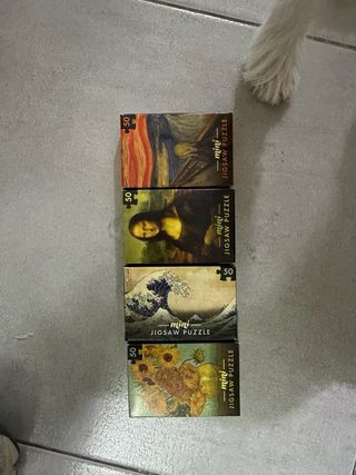 Conjunto de cuatro mini puzzles con reproducciones de obras de arte famosas. - Puzzle de Los Girasoles de Van Gogh. - Puzzle de La Gran Ola de Kanagawa de Hokusai. - Puzzle de La Gioconda de Leonardo da Vinci. - Puzzle de El Grito de Edvard Munch. - Cada puzzle tiene 50 piezas. Los he montado una vez y estan todas las piezas